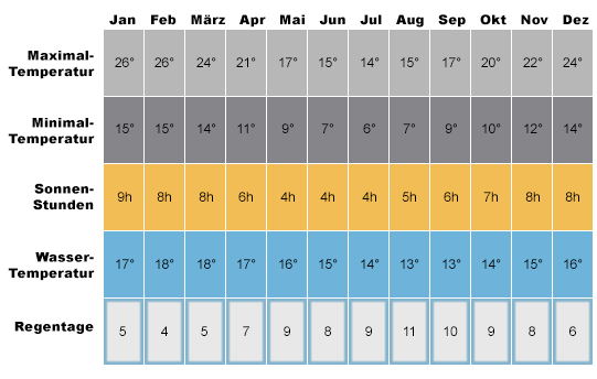 Im Dezember erlebt man die längsten Stunden Tageslicht mit einem Sonnenaufgang um ca. 6:00 Uhr und einem Sonnenuntergang um 20:45 Uhr und im Juni sind die Tage am kürzesten, mit einem Sonnenaufgang ungefähr um 7:30 Uhr und einem Sonnenuntergang ungefähr um 17 Uhr.